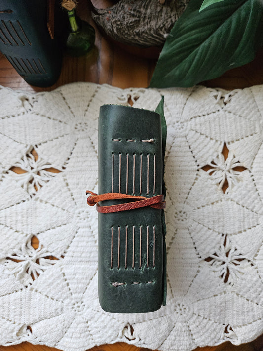 Forest Green Leather Journal with Brass Buttons & Leaf Design