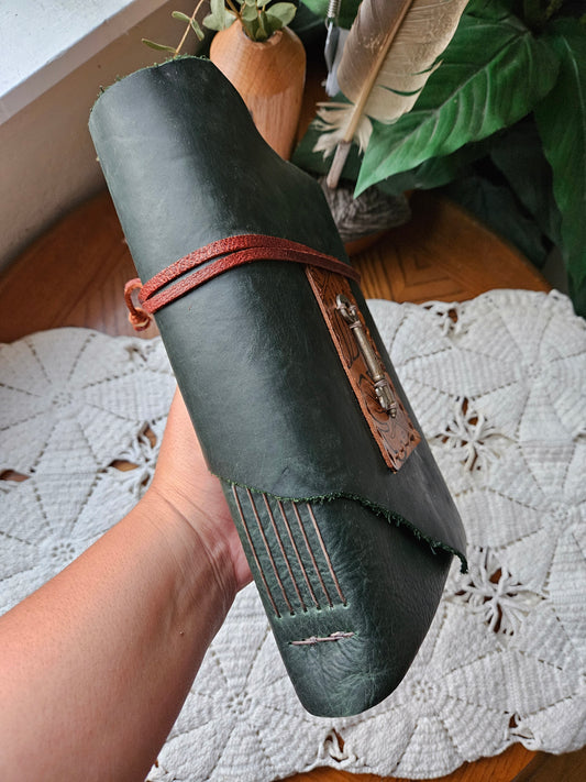 Large Forest Green Leather Journal with Unique Raw Edge & Antique Brass Key