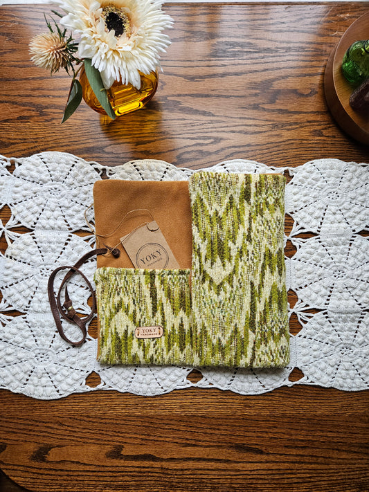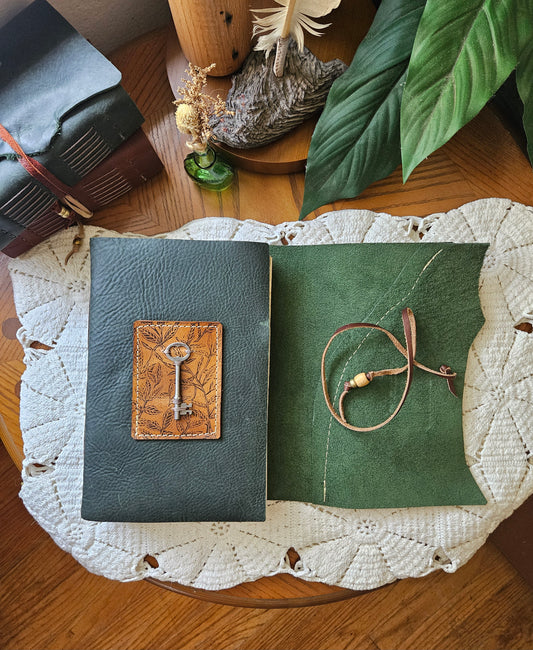 Forest Green Leather Journal with Raw Edge, Brass Key & Botanical Design